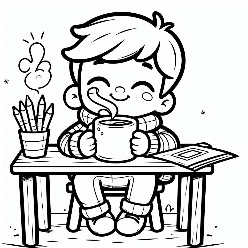 Smiling child with warm mug, pencils ready to color