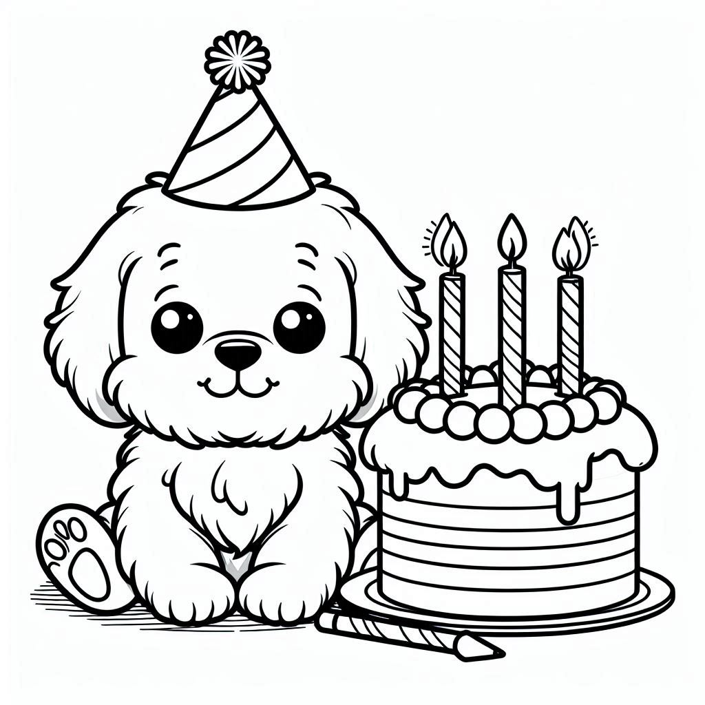 Fluffy pup, tall candle cake, sweet birthday coloring fun
