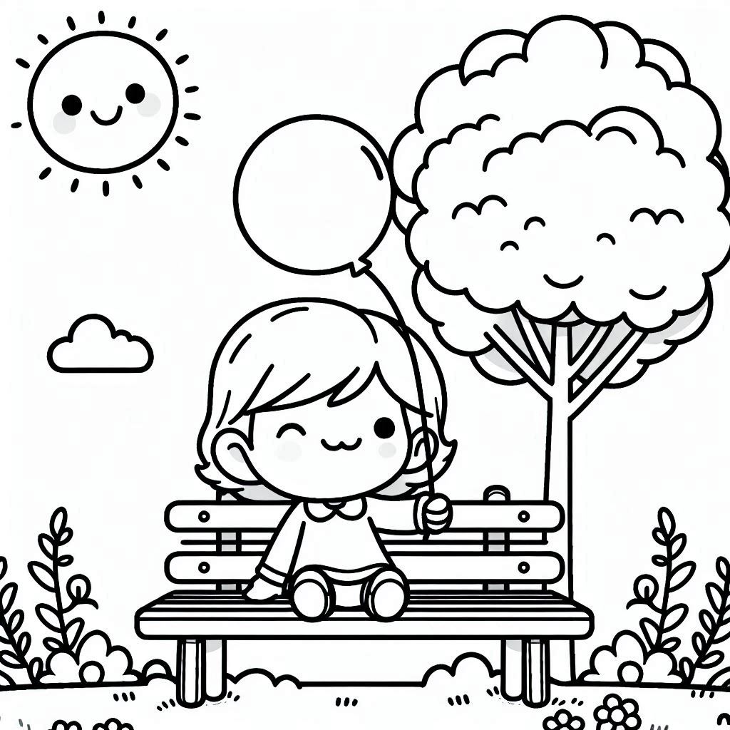 Happy kid on a bench with balloon, bright sun, soft lines
